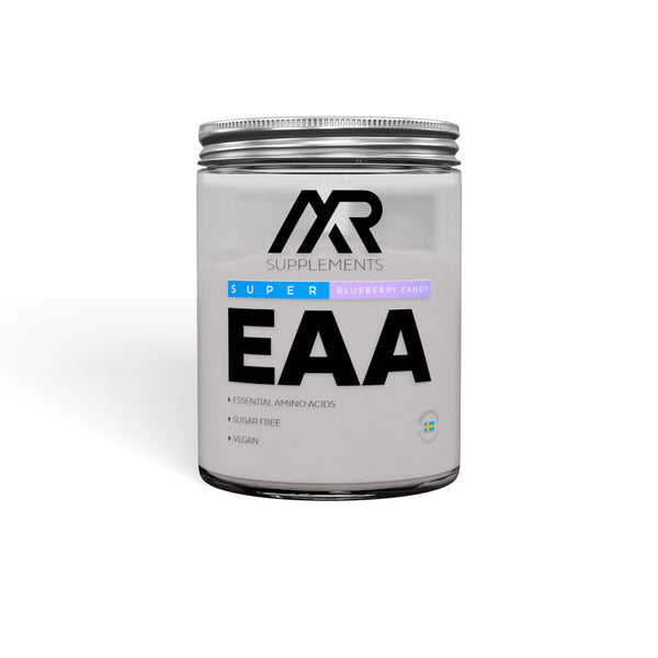 Vi kallar vår produkt Super EAA eftersom den samlar alla nio essentiella aminosyror i en färdigblandad formula, med samma aminosyror som återfinns i många olika proteinkällor i kosten. Vår Blueberry Candy-variant kombinerar EAA med BCAA i ett balanserat 2:1:1-förhållande, samt extra glycin och alanin. Allt är sockerfritt, veganskt och har en fräsch smak som påminner om blåbärsgodis.
